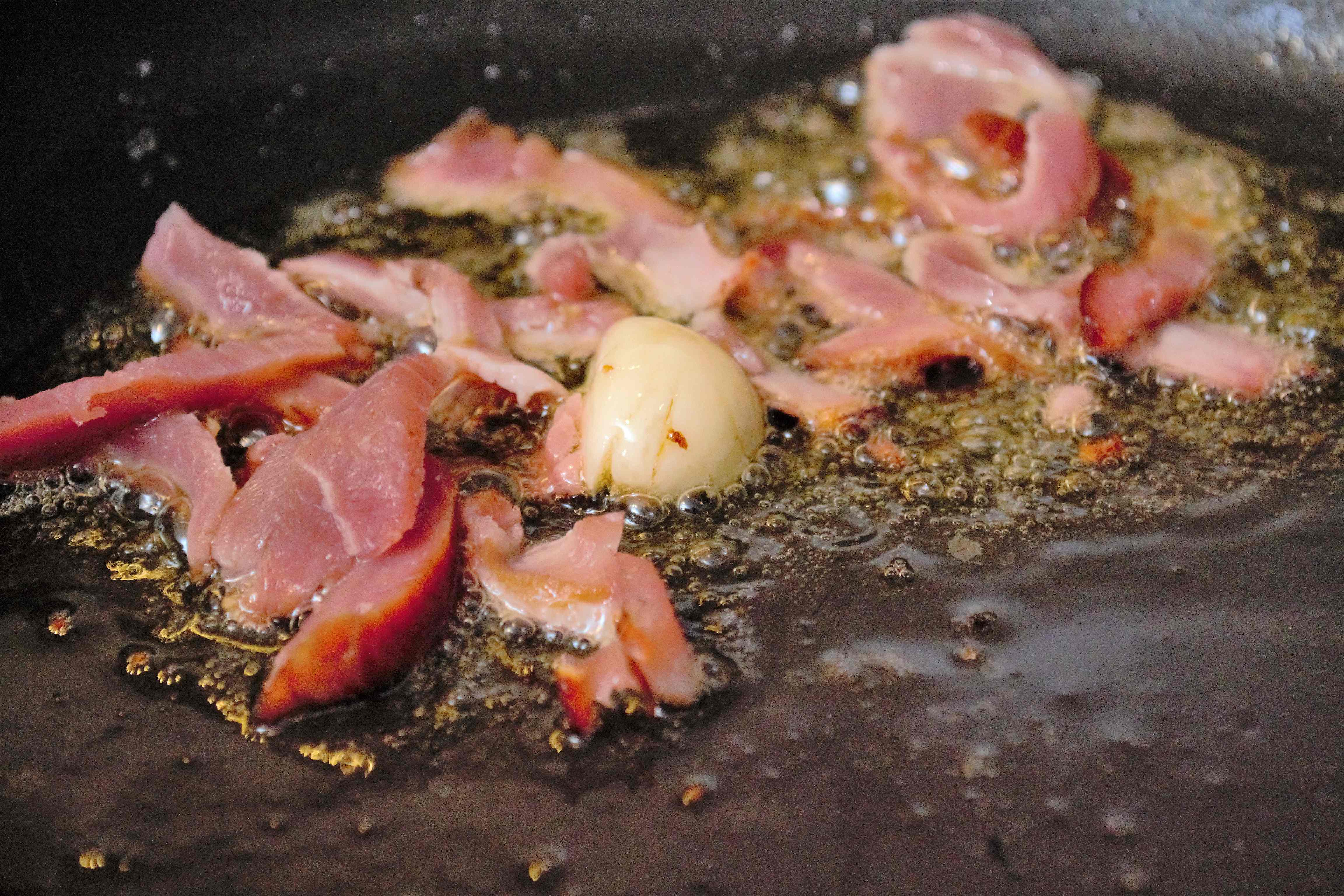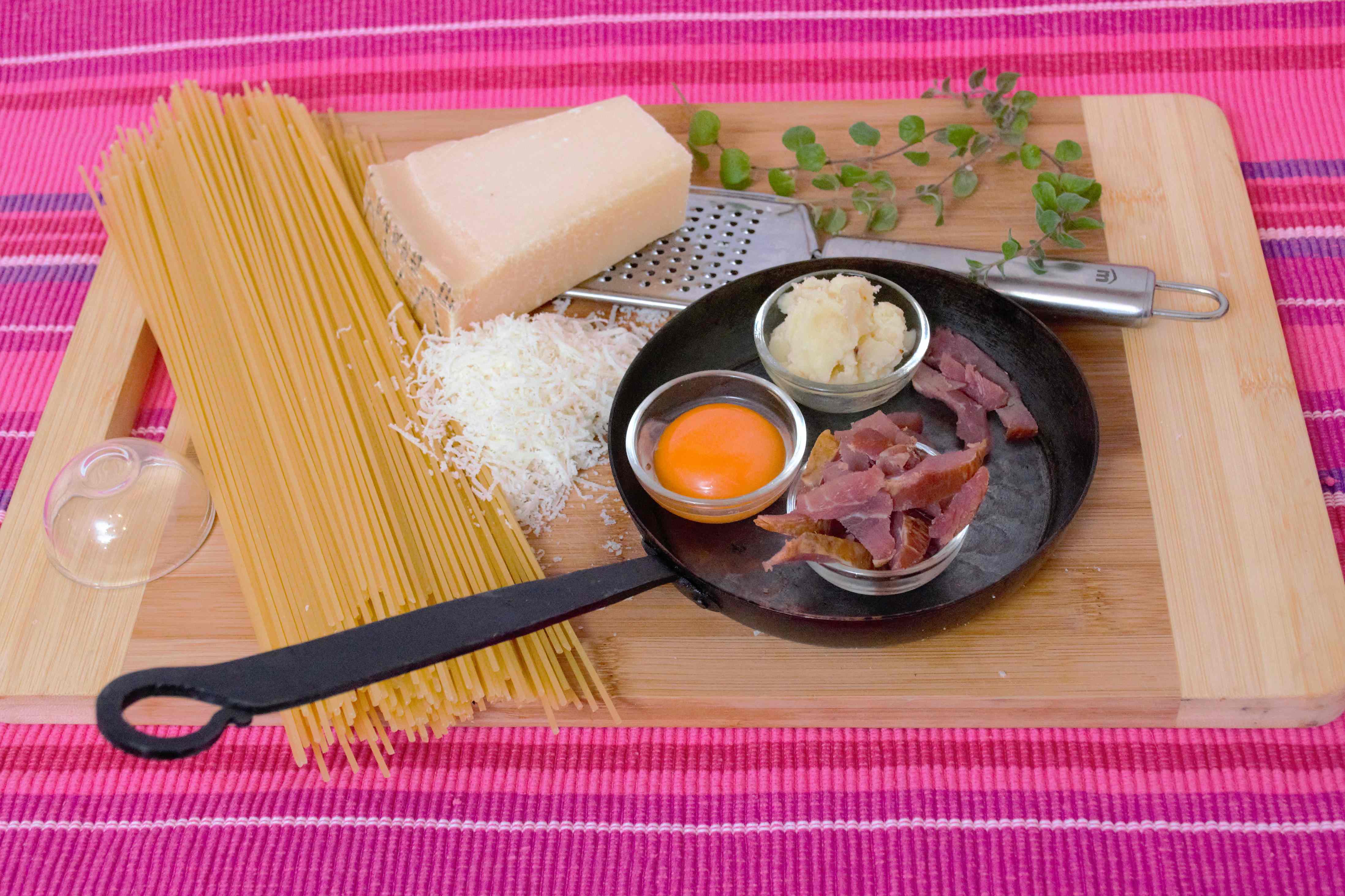 Noi mergem pe simplitate de data aceasta, cu cateva „imbunatatiri” personale. Asadar, ingredienele folosite de mine au fost: spaghete, parmezan, untura de rata, muschiulet de porc afumat si galbenus de ou. Am mai improvizat putin la sfarsit adaugand un cub de unt.