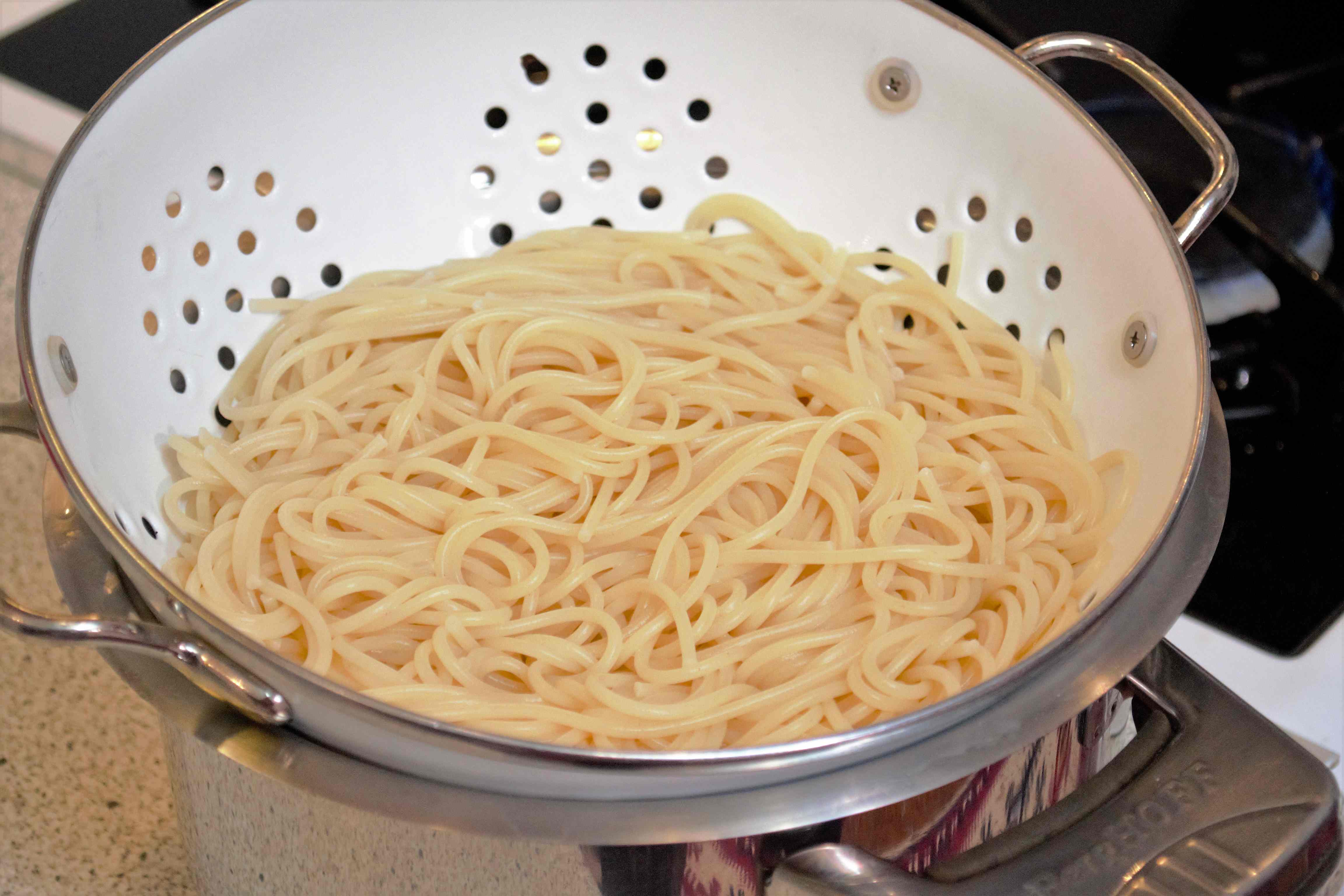 Preparatia nu dureaza mult. In apa cu sare am pus pastele la fiert. Le-am fiert conform timpului de pe pachet. Daca folositi paste proaspete, timpul este de 2 – 3 minute.