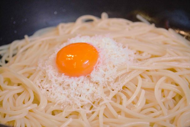 Cand pastele au fost gata, le-am pus peste carnea prajita, am adaugat ou, parmezan si 100 de ml din apa in care au fiert pastele. Tigaia in acest moment nu mai sta pe foc, altfel transformam galbenusul in omleta.