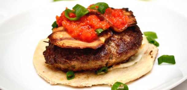 M-am gandit zilele trecute ca a trecut mult timp de la ultimul hamburger mancat, ba chiar facut de mine. Cum se intampla de multe ori in ziua de astazi, eram pe fuga. Veneam de undeva, plecam in alta parte si aveam o fereastra destul de mica pentru a servi masa. Desigur, in drumul meu gaseam destule covrigarii, buticuri si chiar cateva shaormerii si alegerea ar fi fost destul de simpla, ba chiar limitata. Intre merdenele si shaorma, am intrat intr-un mic supermarket si am luat 400 de grame de carne tocata de vita si vreo doua ciuperci. Stiam ca mai am acasa ceva verdeata, deci nu m-am stresat prea tare cu asta. Pana sa ajung acasa, am trecut pe langa un fast food libanez, de unde am cumparat vreo 4 lipii. Le fac acolo, dupa o metoda traditionala, sunt mereu proaspete (chiar calde) si foarte bune la gust.