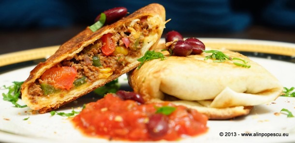 Timp de pregatire: 40 minute Ingrediente:16 foi de tortilla 600 g carne de vita tocata 100 g fasole din conserva 100 g porumb din conserva 2 ardei grasi mici 1 ardei iute (optional) o ceapa mica 200 g de sos salsa o lingura de pasta de ardei dulce sare, piper Portii: 8 Un nume interesant, …