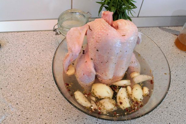 Povestea zice ca nu e nevoie ca un pui sa fie neaparat rumenit ca sa il poti devora din prima. Asa ca ia matale o puicana de un an, si, dupa ce ai alergat-o prin curte, las-o putin sa se linisteasca intr-o saramura (2 linguri de sare la litrul de apa) in care ai pus si cate ceva pentru miros si gust: usturoi, ceapa, piper.