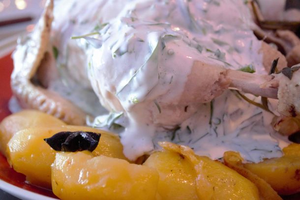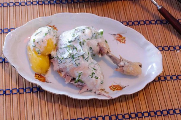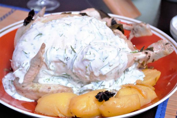 Cand e gata pasarea, o scoti pe farfurie si o ungi cu smantana ce acum a prins toata aroma tarhonului, aroma care, la intalnirea cu carnea calda, arunca in toata casa note usor mentolate, usor intepatoare.