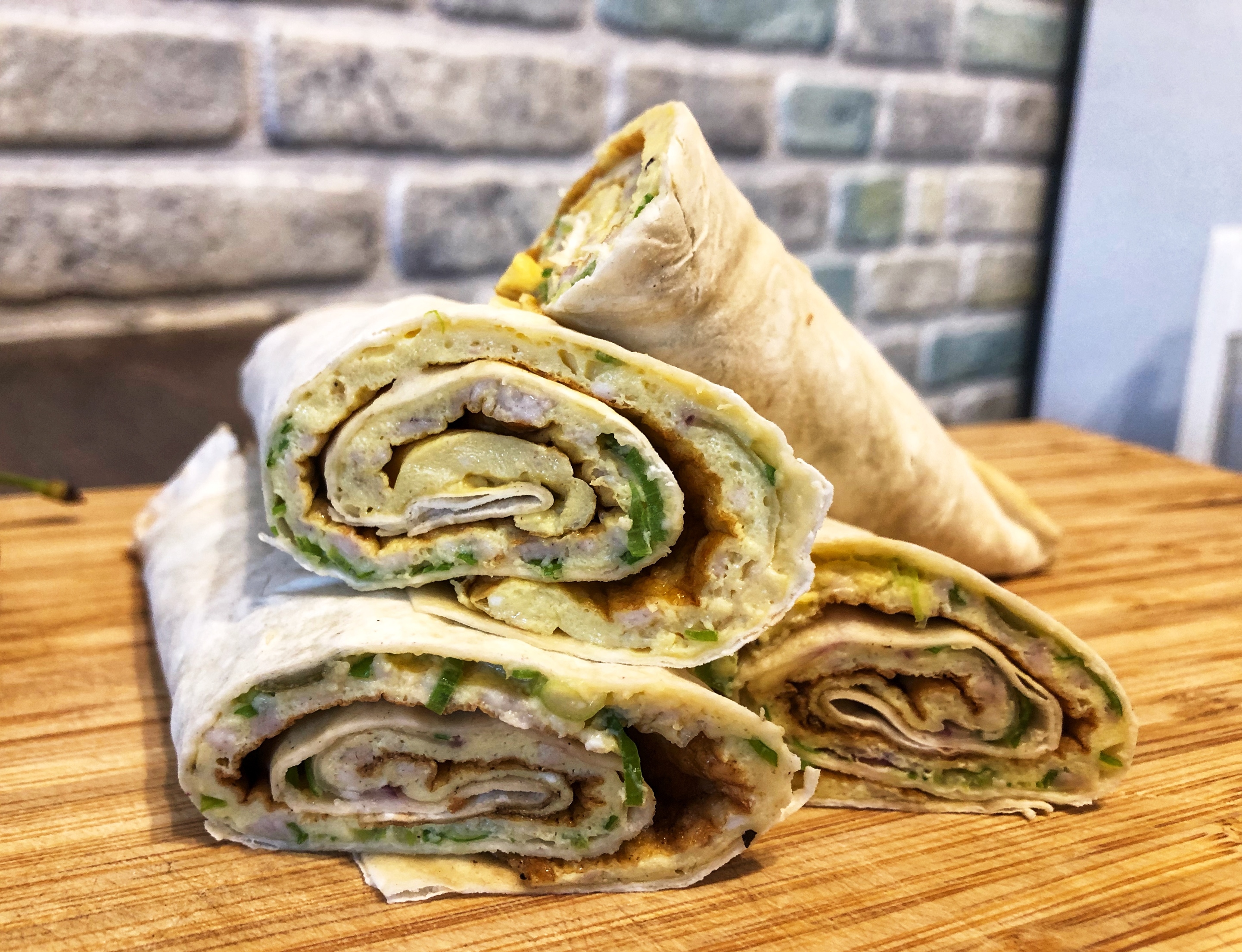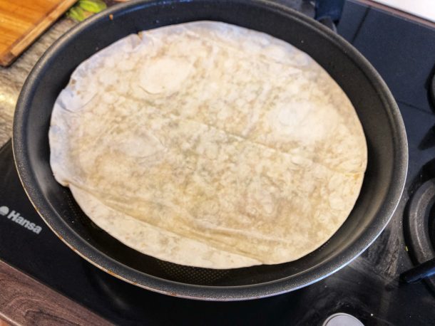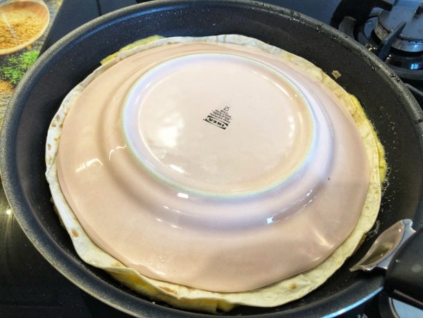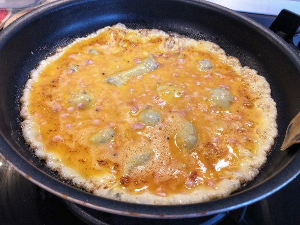 Cand omleta a inceput sa se intareasca, chiar daca era moale la suprafata, am pus o lipie peste toata omleta.