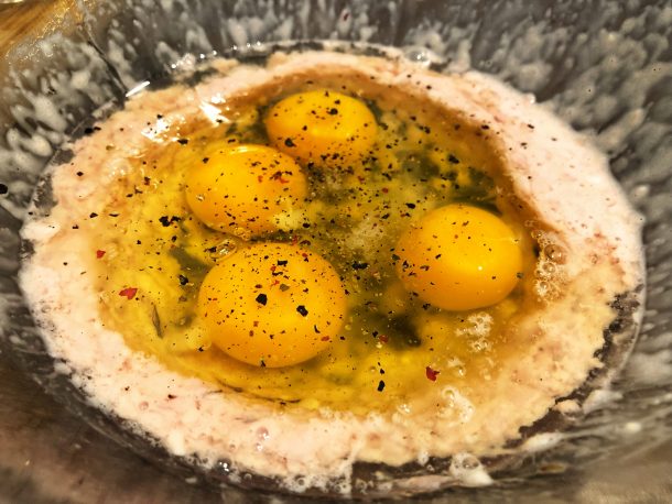 In primul rand, am transformat laptii intr-o pasta, peste care am adaugat oua, sare si piper.