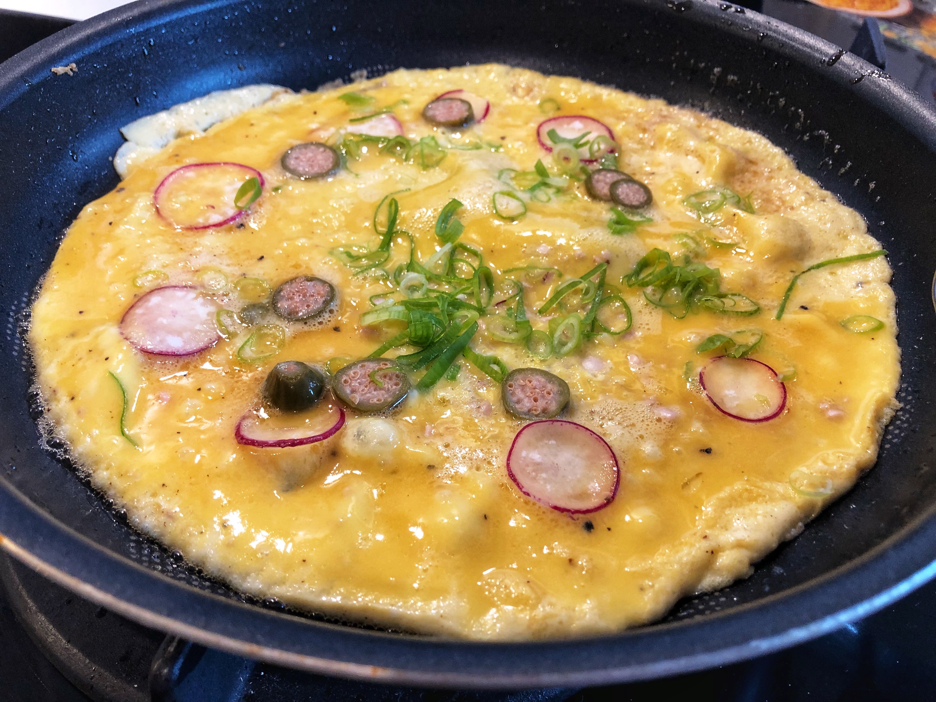 Am incins bine unt in tigaie si am pus jumatate din compozitie, care a inceput sa faca bulbuci. Am pus deasupra ceapa verde, ridichii, capere.