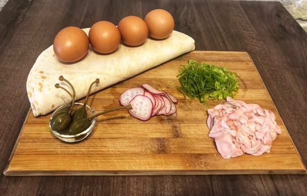4 oua lapti de peste un fir de ceapa verde o ridichie rosie capere sare, piper, unt