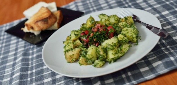 Timp de pregatire: 30 minute Ingrediente:1 kg cartofi 2 legaturi de marar 3 legaturi de patrunjel 3 rosii 50 g unt sare, piper ulei de masline otet de mere (optional) susan (optional) Portii: 3 Pentru ca au fost cartofi noi prin piete, si pentru ca imi plac verdeturile, am compus aceasta reteta. Am pornit inital …