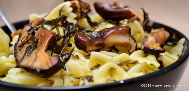 Toata operatiunea asta a durat cam 8 minute. In aceste minute s-au fiert pana la punctul de „al dente” doua cani de paste cu ou. Asa ca am asezat ciupercile deasupra si ca bonus, pentru aroma, o lingura de pesto.
